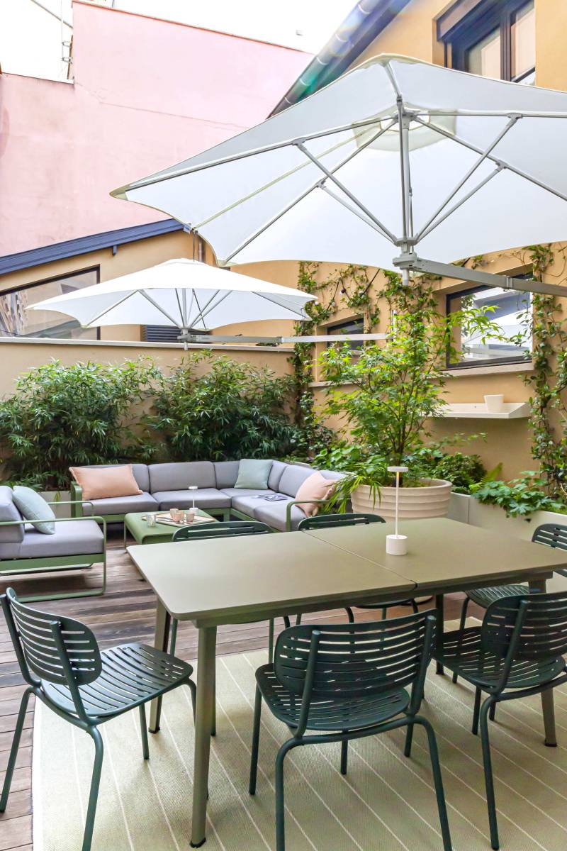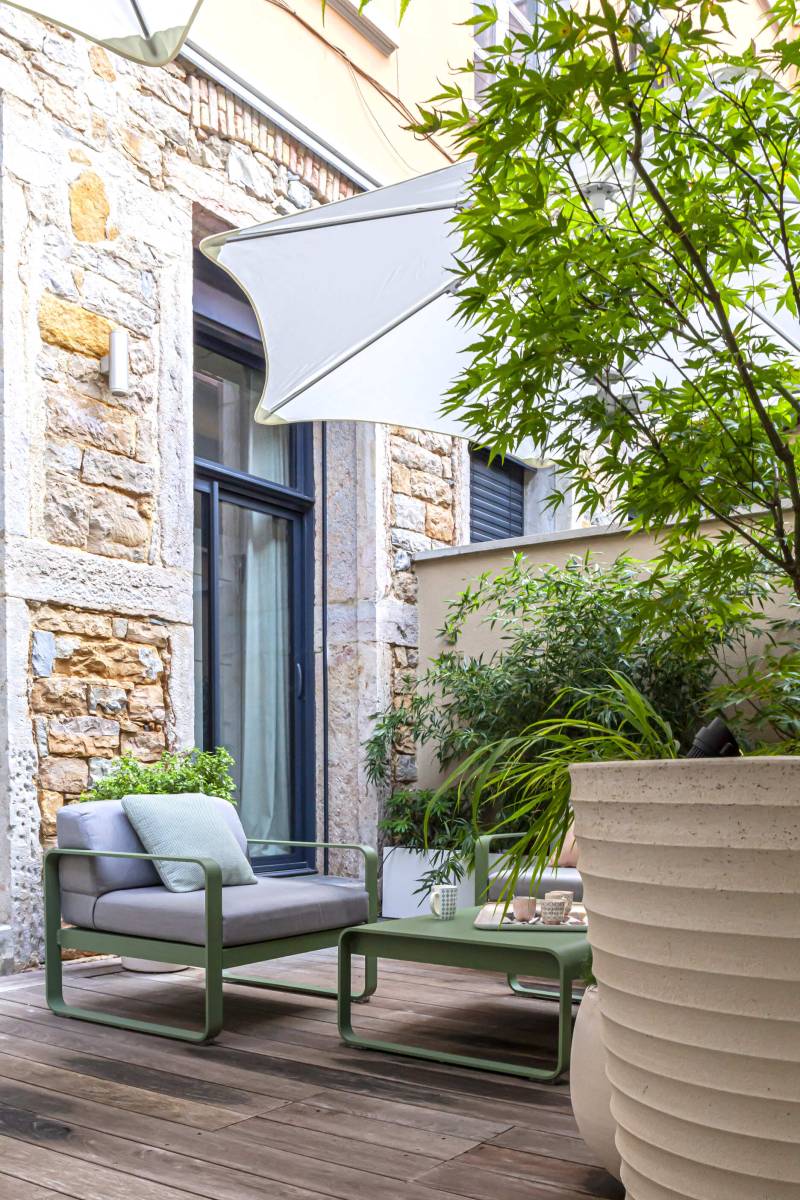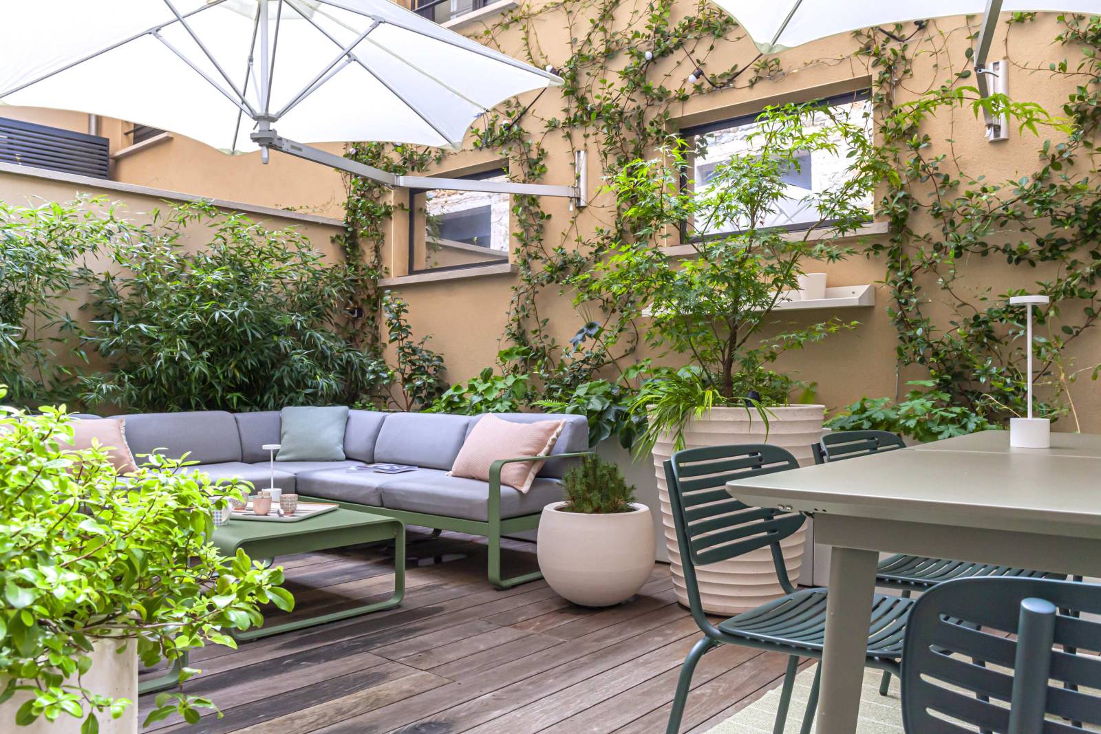 En lien direct avec les pièces de vie de l'appartement, le patio offre un écrin de verdure, clos de murs, à l'abri des regards et du tumulte de la ville.