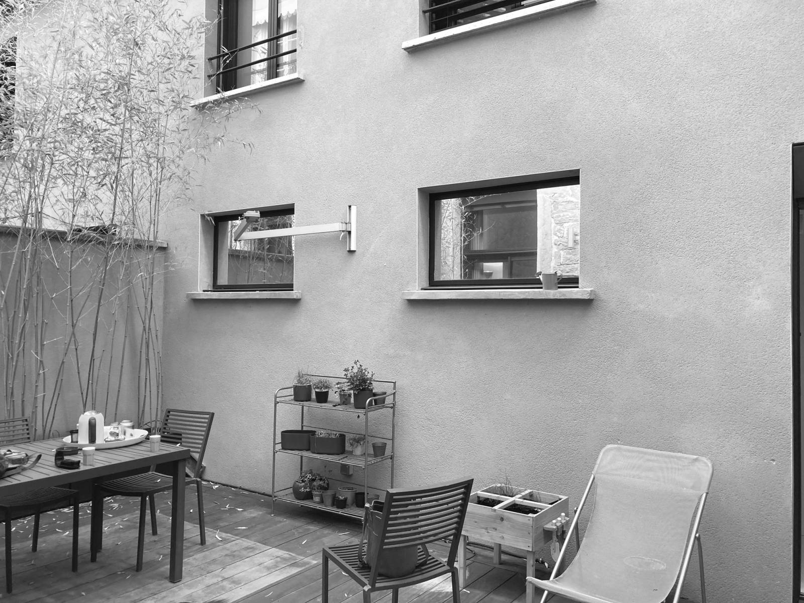 Les matériaux existants à l'origine du projet sont le bois du sol et les murs en pierre dorées, caractéristiques de la ville de Lyon. Notre objectif principal était de végétaliser le patio pour créer des scènes arborées et rafraîchir l'air en été. La périphérie du patio est bordée de bacs plantés de vivaces fleuries et de petits arbustes de mi-ombre et de terre de bruyère.