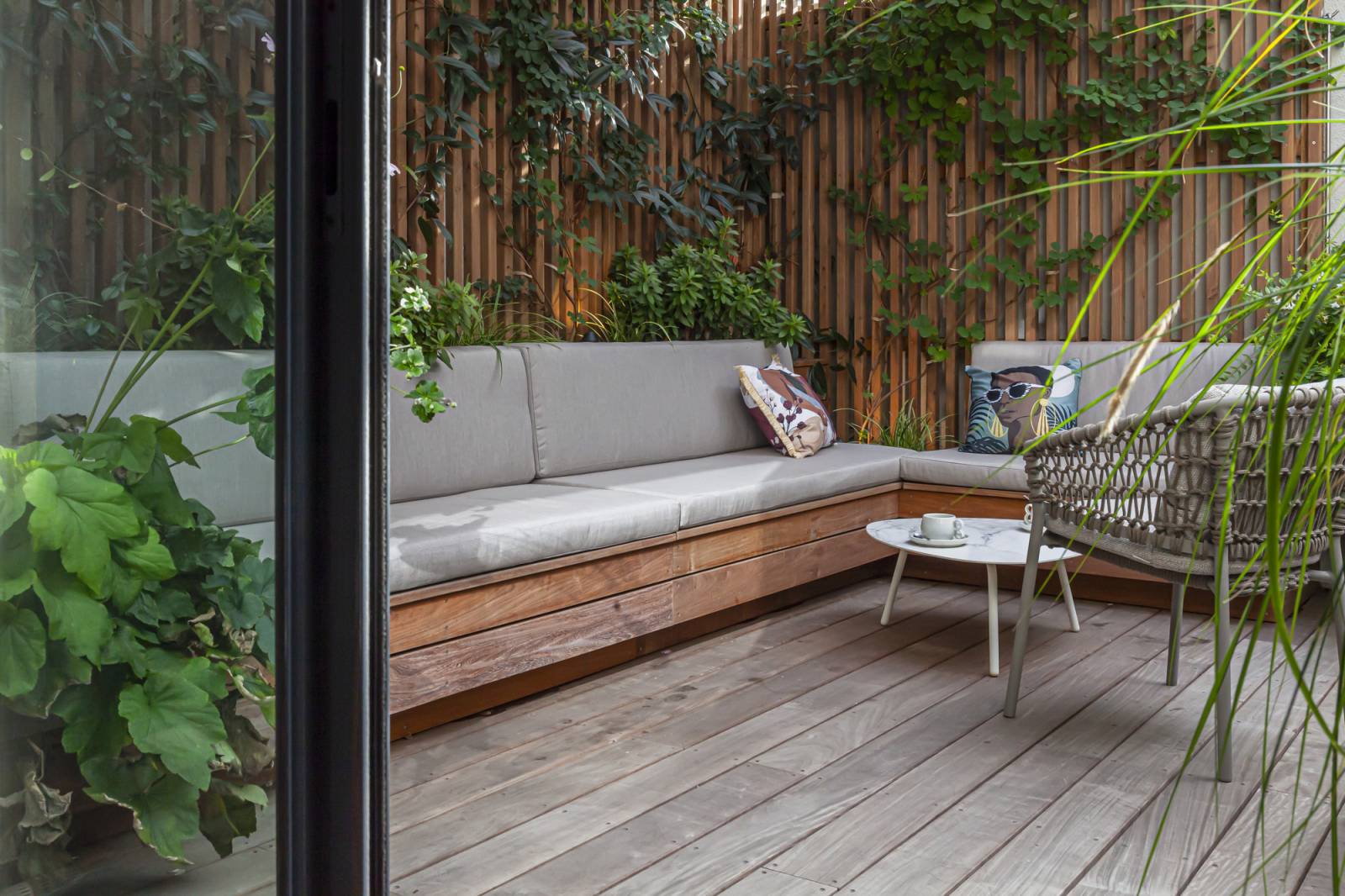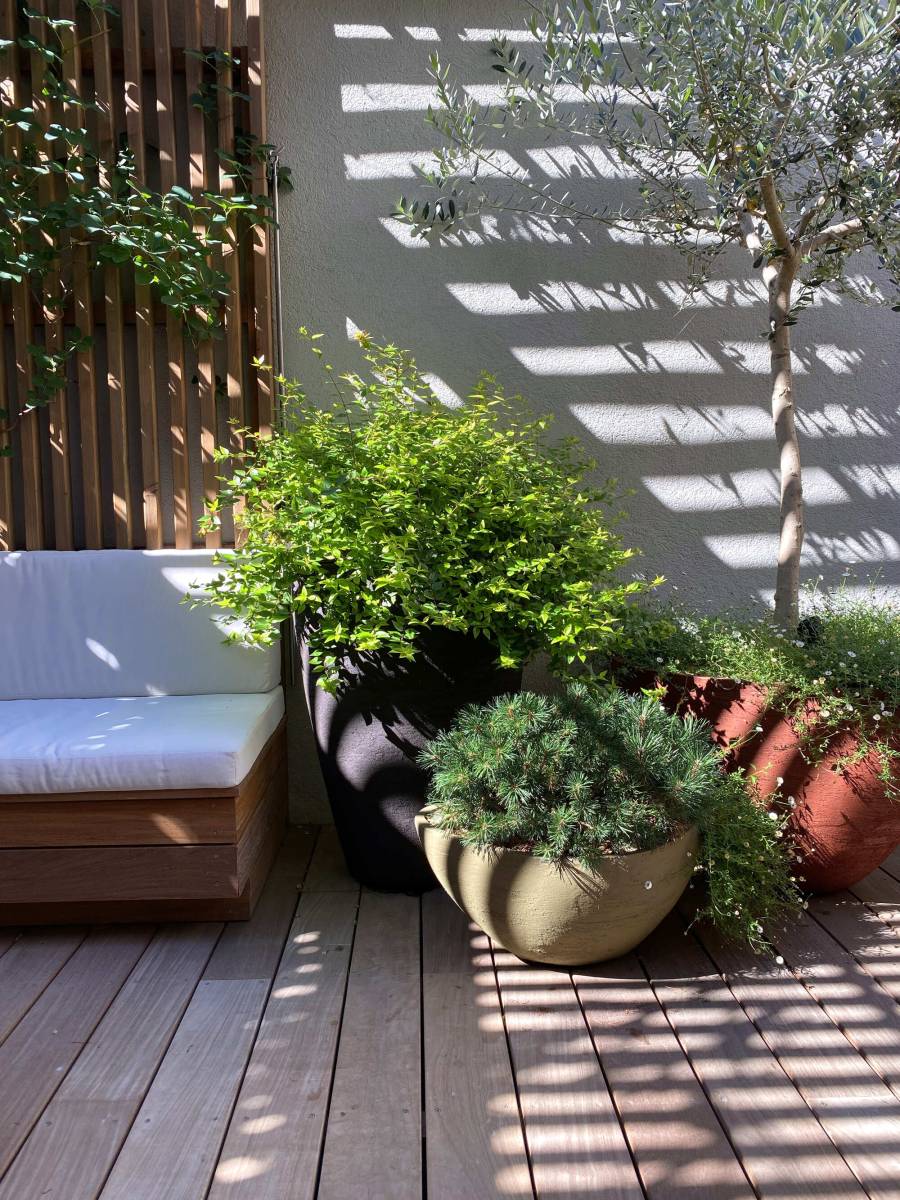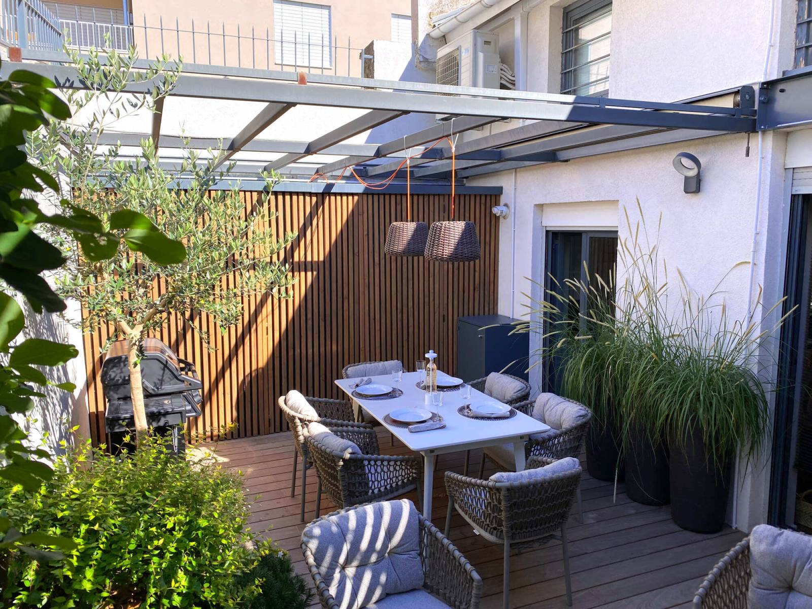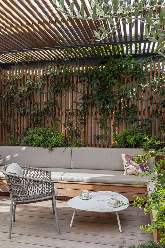 Il est devenu possible couvrir intégralement ou partiellement la terrasse. Cette pergola en bois, doublée d'une autre en toile, permet aussi de protéger le patio du vis-à-vis important avec un immeuble voisin qui le surplombe. Des plantes grimpantes sont plantées dans des longues jardinières en bois, réparties derrière la banquette du salon. Elles grimpent sur l'ensemble du claustra appuyé contre les murs périphériques de la terrasse et colonisent progressivement le toit de la pergola.
