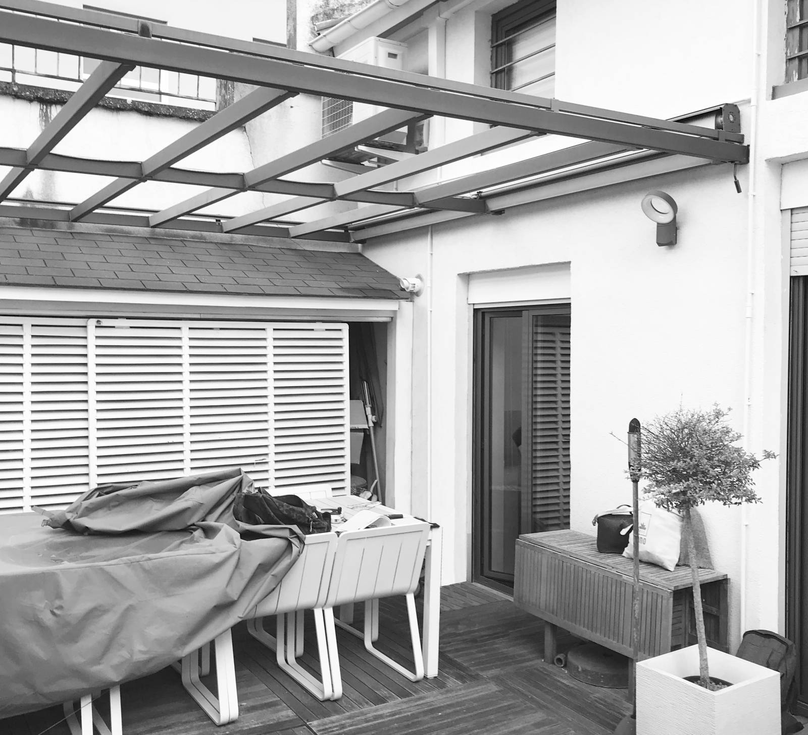 La principale problématique de ces espaces était le fort ensoleillement aux périodes les plus chaudes de l'année et le besoin de conserver de la lumière pour ne pas assombrir l'appartement en hiver. Nous avons donc dessiné et fait réaliser par une entreprise de menuiserie, une pergola amovible composée de deux éléments coulissants, habillés de tasseaux en bois.