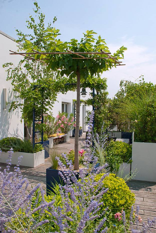 Ces bacs crées sur mesure, de hauteur et largeurs variables, créent un rythme permettant de rompre la linéarité de la terrasse.