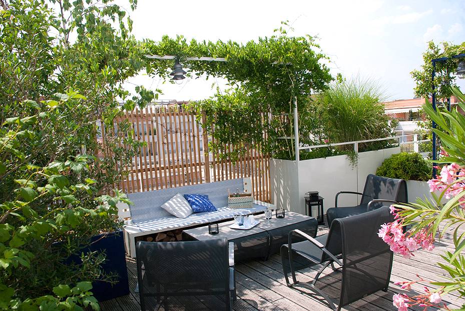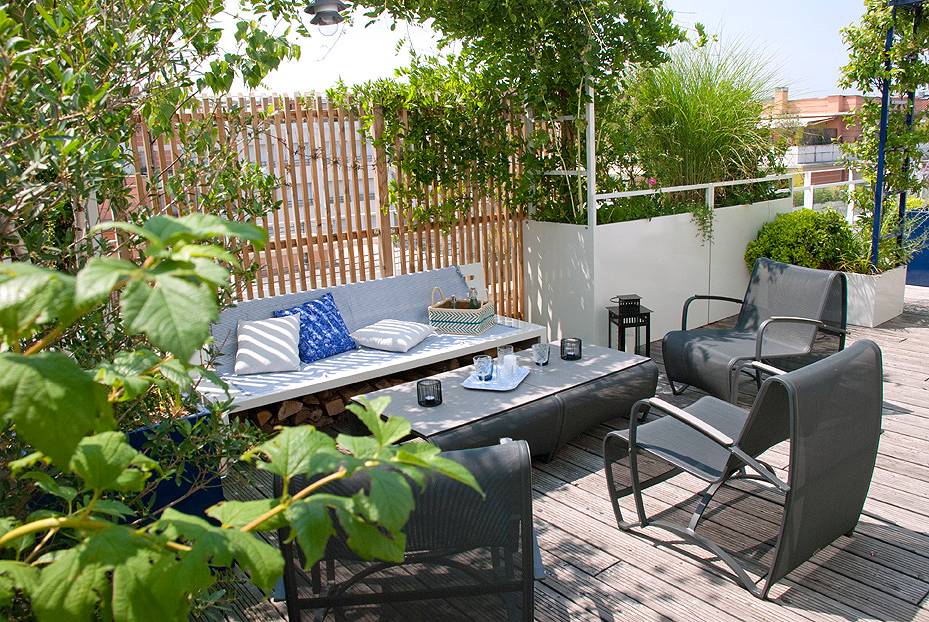Plusieurs espaces de vie, agencés en fonction des pièces intérieures, se succèdent à ciel ouvert. Autour du salon de jardin, protégé du vis-à-vis par un brise-vue en bois ajouré, des végétaux, provenant de pépinières locales, créent une ambiance champêtre et fleurie. Les floraisons aux tonalités roses et bleues s’accordent aux coloris des bacs en acier dessinés sur-mesure pour permettre de rehausser les plantations et de sécuriser la terrasse par un garde-corps plus protecteur.