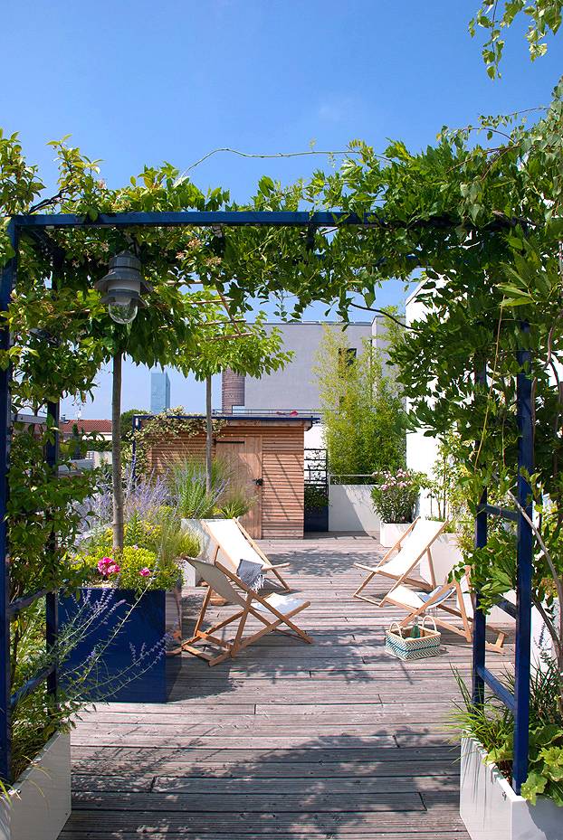 Sur ce toit baigné de soleil, des treilles en acier thermolaqué sont installées pour apporter de l’ombre et marquer le passage d’un espace à l’autre. De même, deux arbres en plateaux alignés au-dessus des transats projettent leurs silhouettes géométriques sur le sol en bois (mélèze).