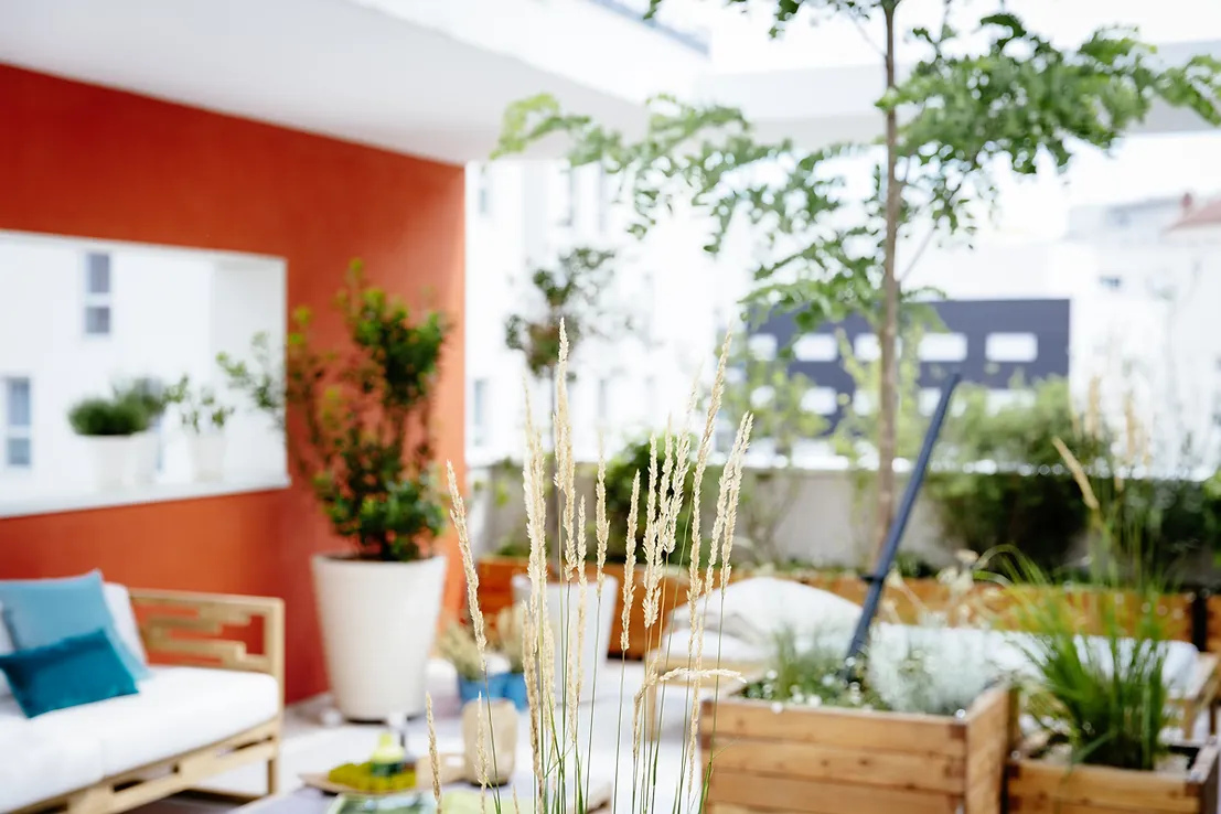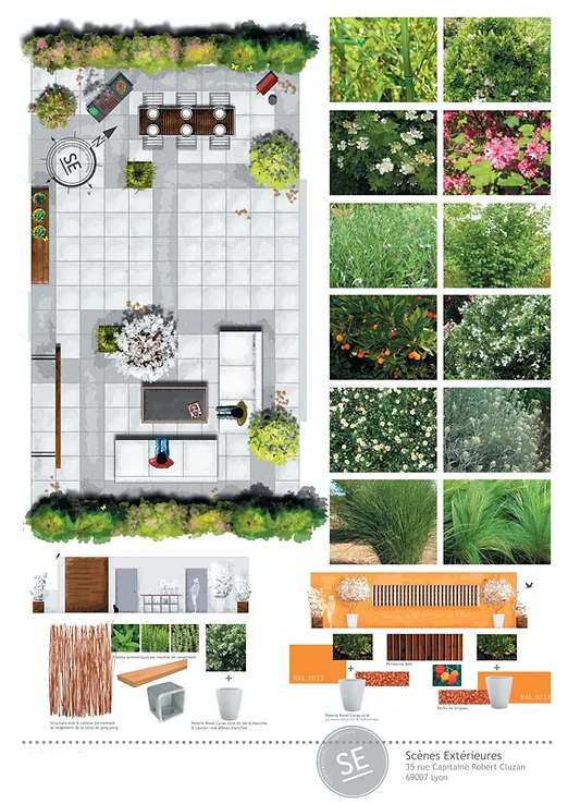 Pour renforcer le caractère patio de l'espace, les murs ont été mis en valeur par un orange lumineux. En contraste de cette couleur superbe, ont été plantés des végétaux dans de hauts pots en terre blanche. Un grand acacia est positionné en axe central, permettant d'articuler les espaces et de donner de la hauteur.